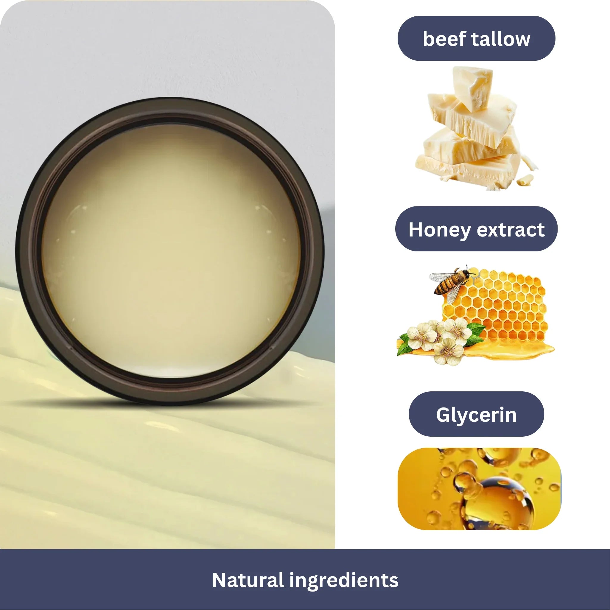 Beef tallow from grass-fed cattle, moisturizing honey extract, and protective glycerin deeply nourish your skin with essential nutrients.