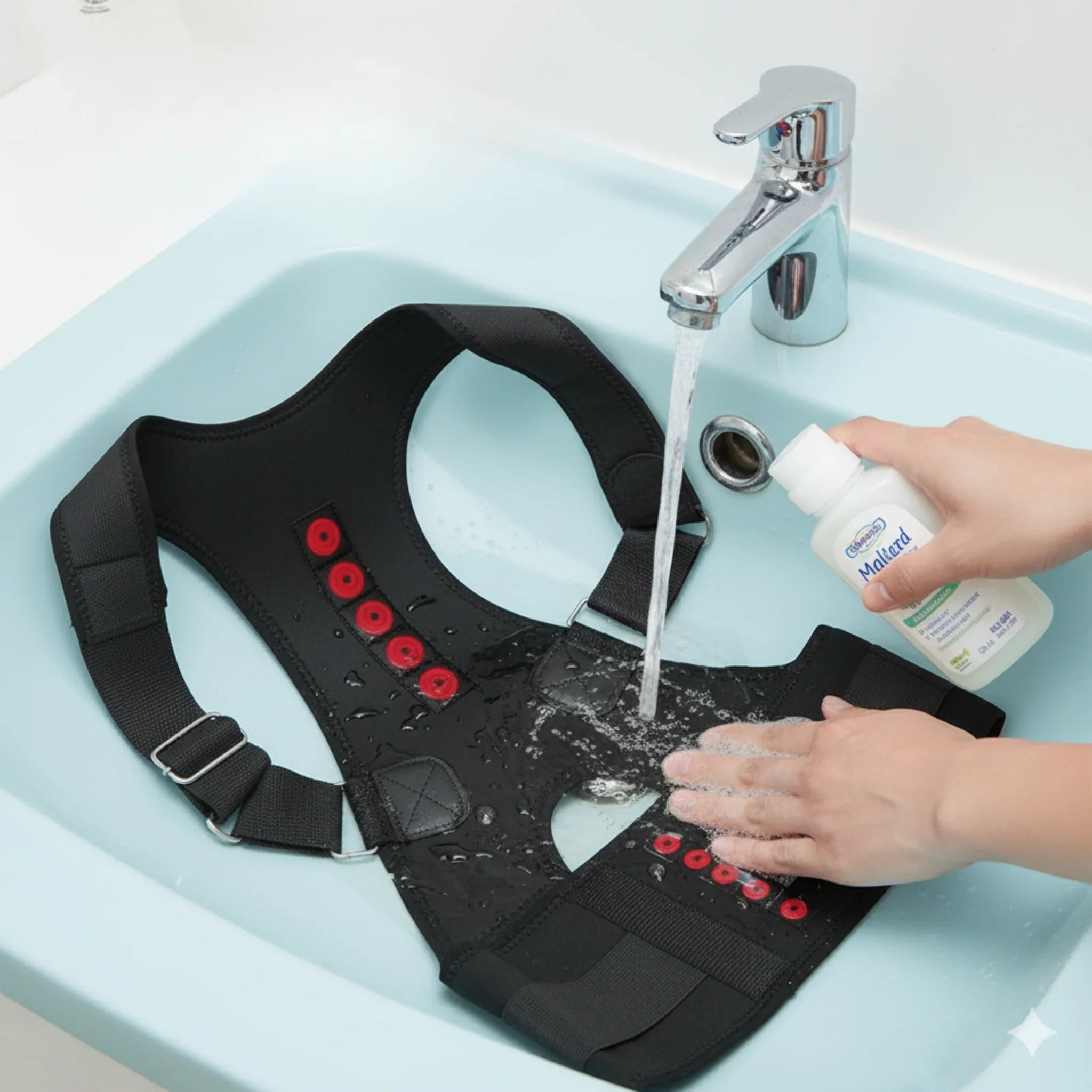 The back brace can be easily hand-washed in cold water with mild detergent.
