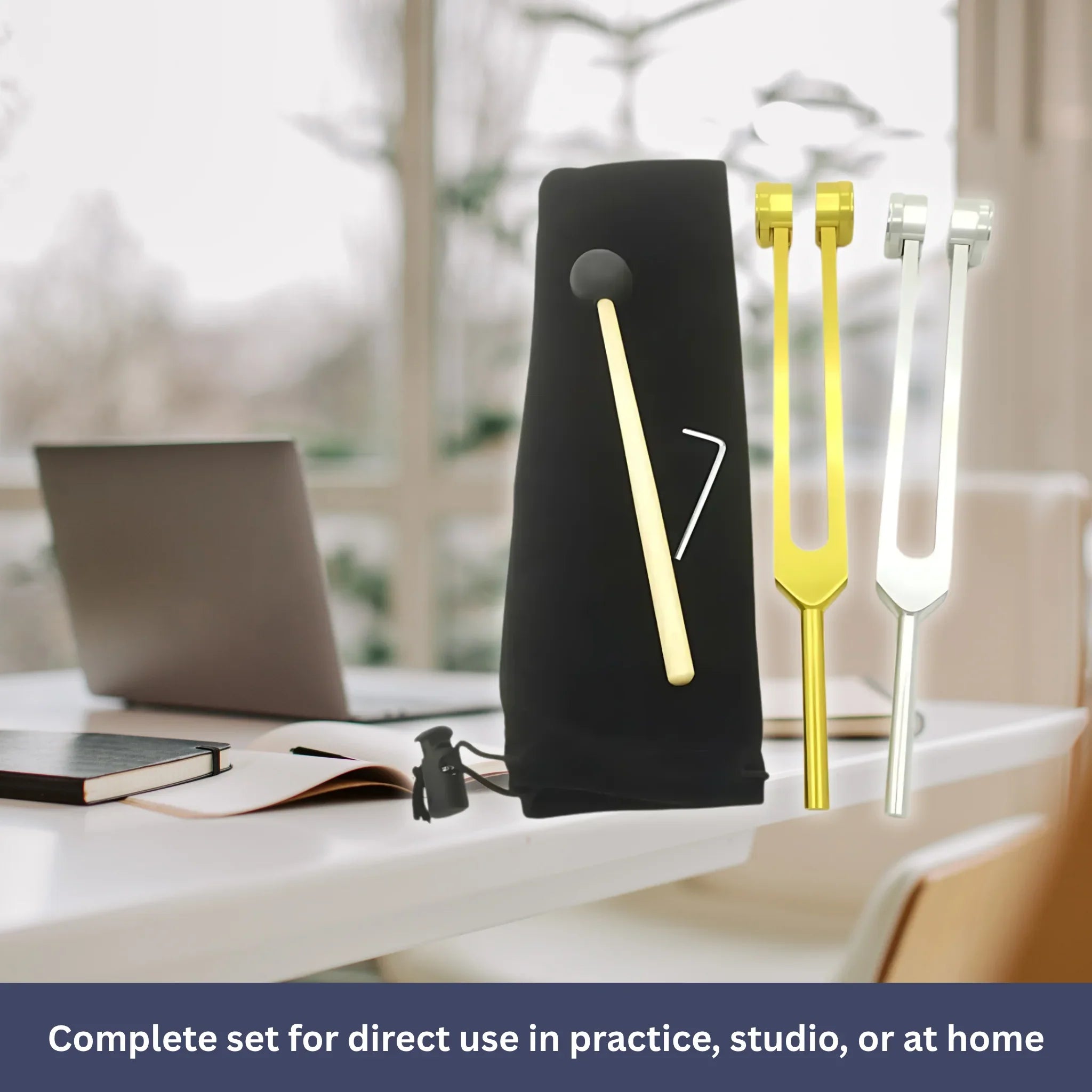 A compact wooden striker is also included, allowing for gentle and precise activation of the tuning fork.