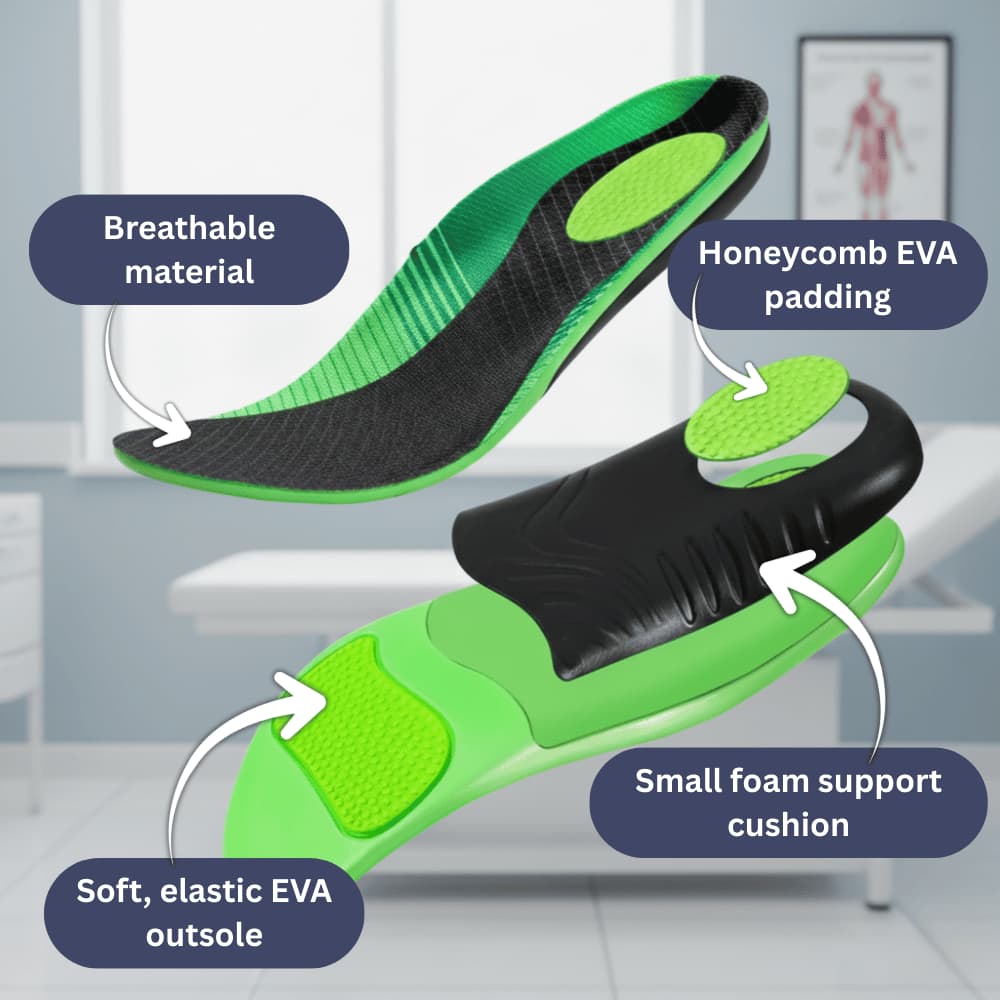 The non-slip EVA base ensures the insole stays firmly in place, while its elastic structure absorbs impact smoothly.