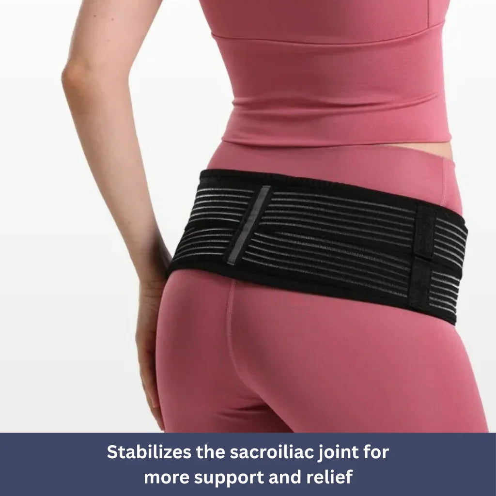 It stabilizes the sacroiliac joint and relieves pelvic pressure as well as strain on the lower back and leg muscles.
