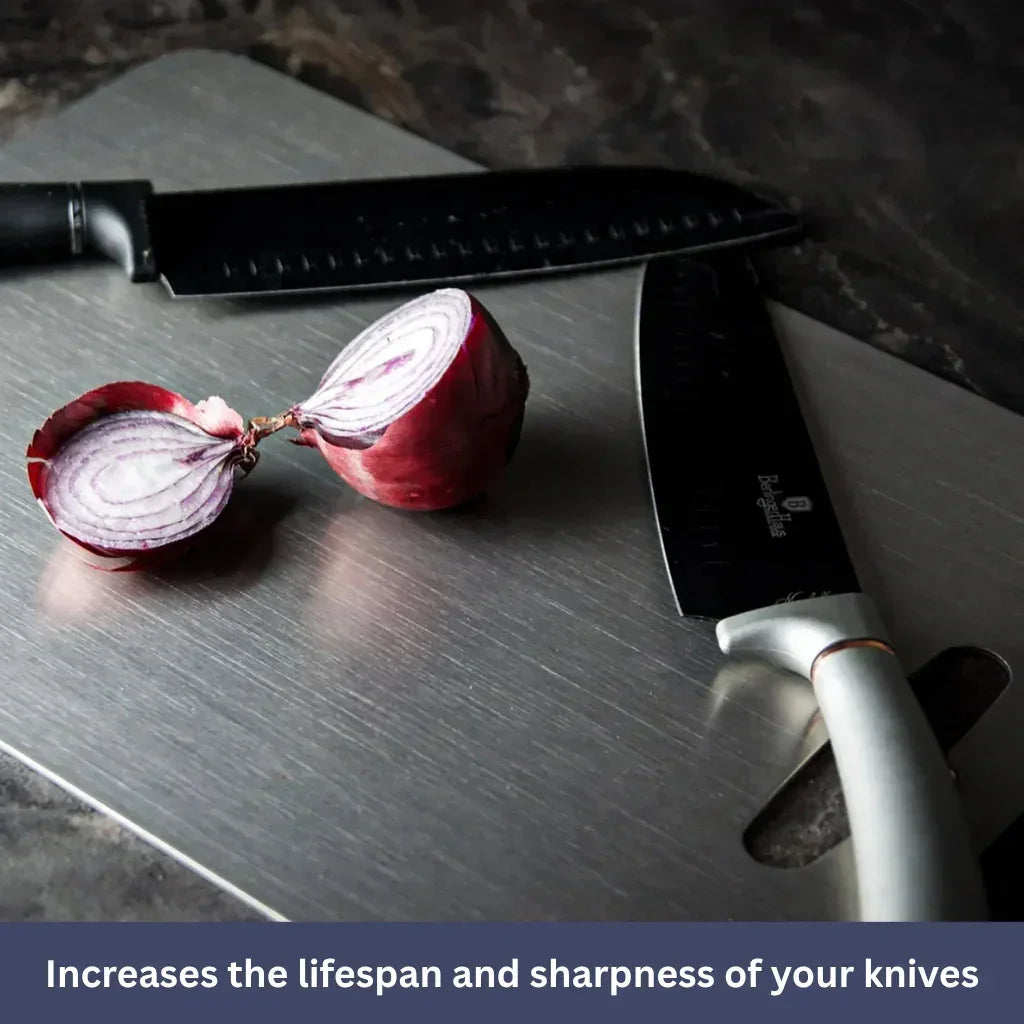 The SteelMaster Cutting Board is gentle on your knives, as stainless steel is softer than blade steel and does not dull the edges during cutting.