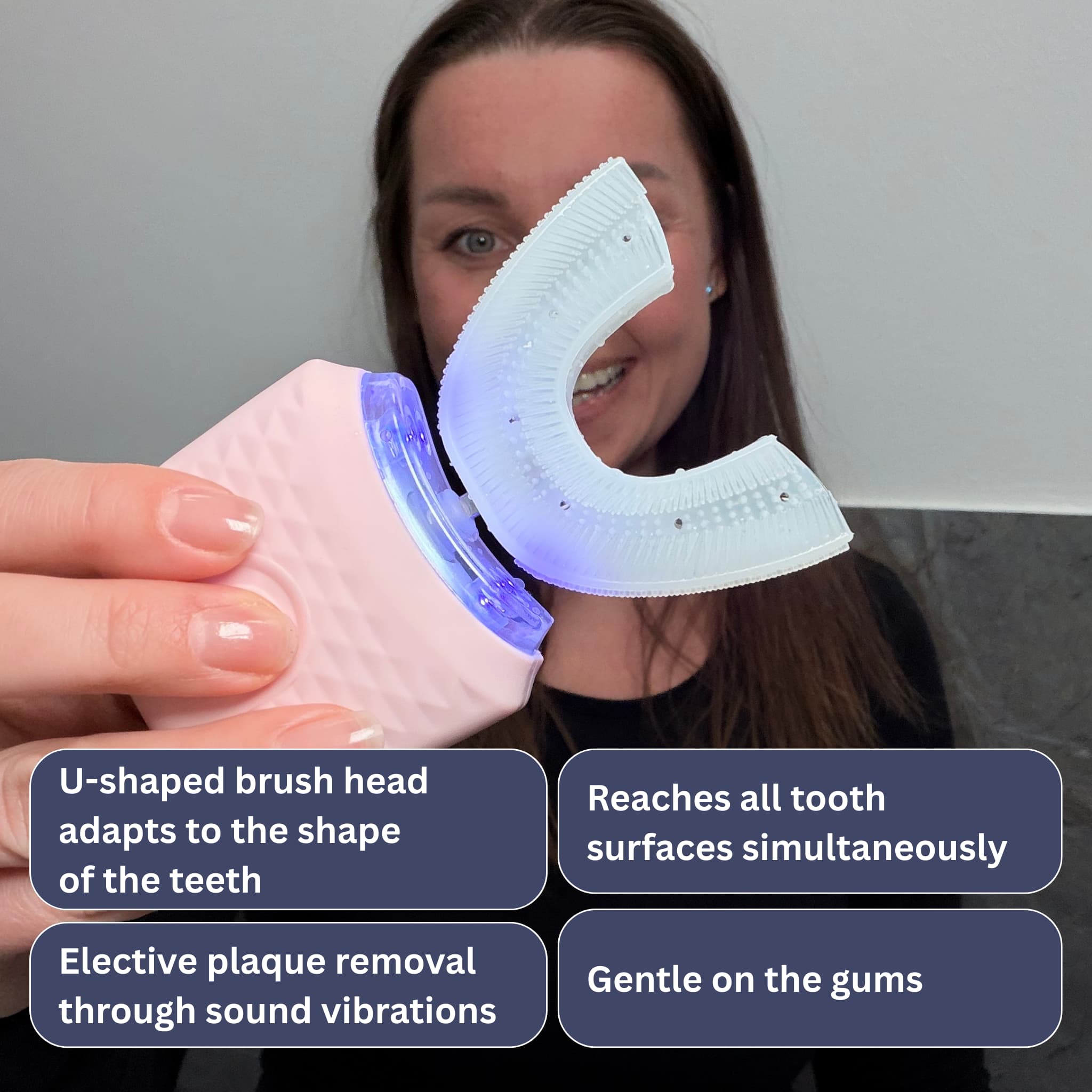 The specially designed U-shaped brush head fits precisely to your tooth shape and reaches all tooth surfaces at once.