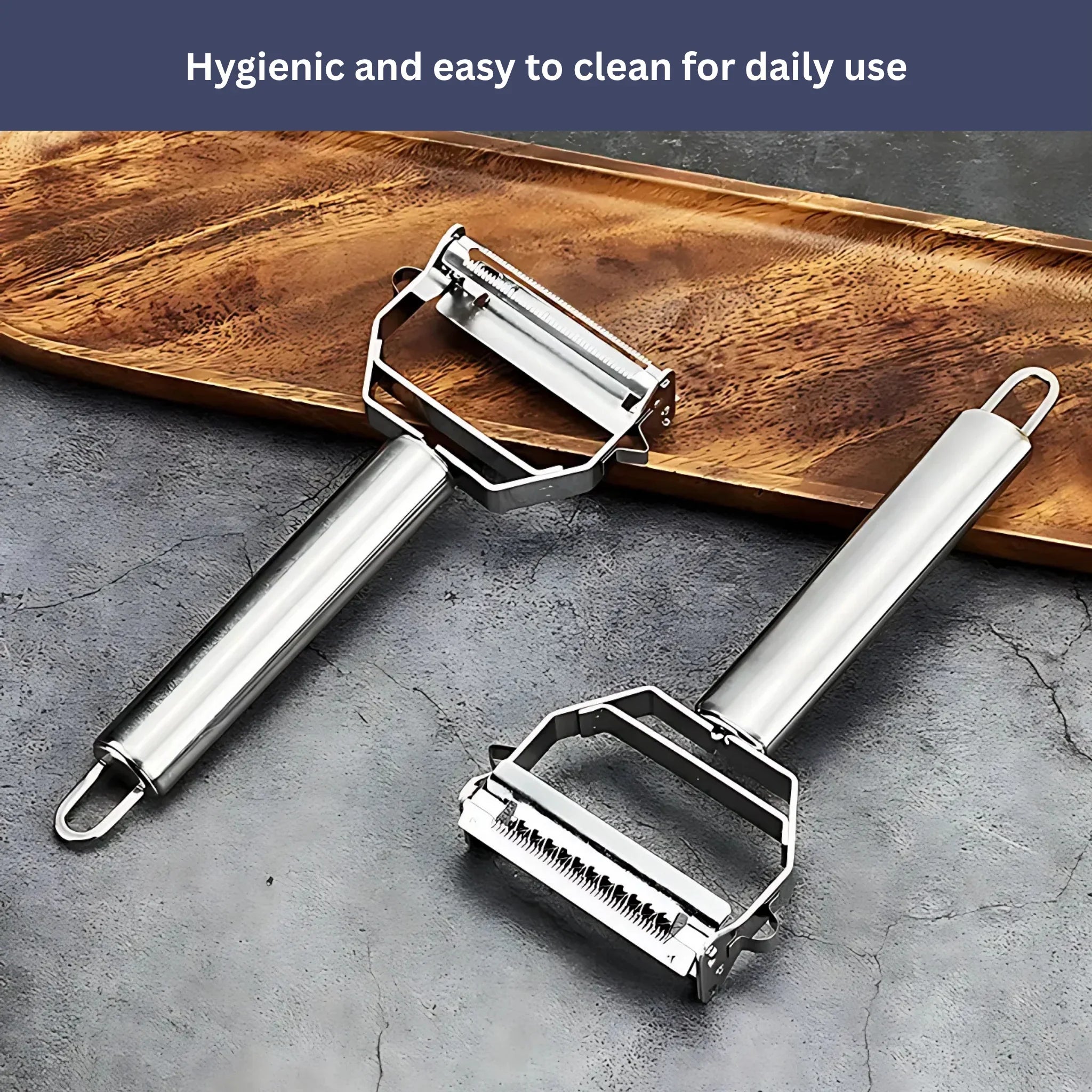 This multifunctional peeler, made from high-quality stainless steel, combines several functions in one compact tool – perfect for fast and practical kitchen work without unnecessary gadgets.