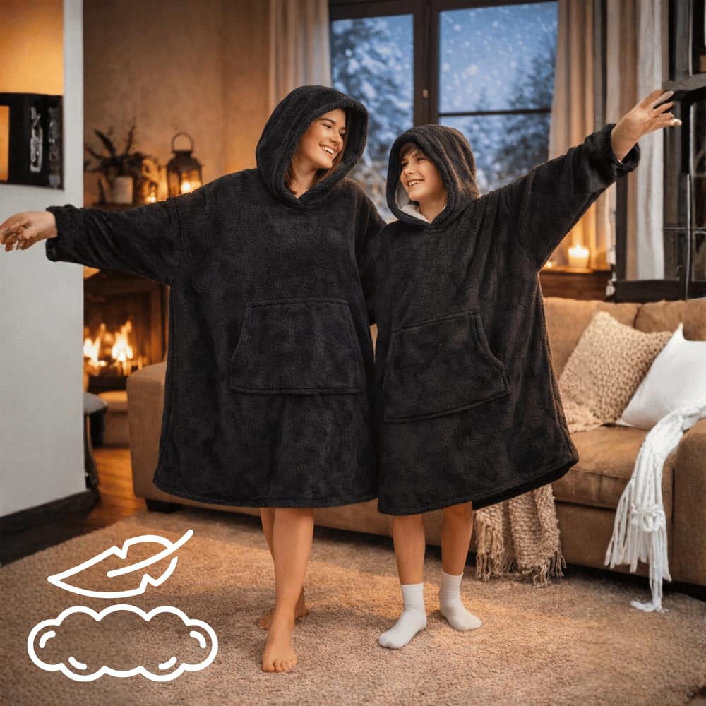 The combination of hoodie, blanket, and oversized sweatshirt creates a uniquely snug wearing experience. The soft, fleece-lined material fully wraps the body and provides instant warmth.